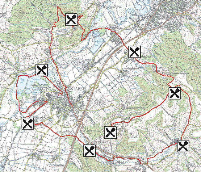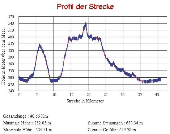 Streckenverlauf: START "Rathaus Bad Staffelstein" - Bahnhof - Alte Bahnunterführung - Richtung REHA-Klinik - Unnersdorf - Richtung Forsthaus (Altenbanz) - rechts „Rote Marder" - Kloster Banz - zweihundert Meter Richtung Kösten - rechts Waldweg Richtung Hausen - über das Wehr in Hausen - Reundorf - Straße Richtung Grundfeld - Basilika Vierzehnheiligen - an der Brauerei TRUNK vorbei - nach 600 Metern rechts Richtung Staffelberg - am Staffelberg wird eine Plateau-Runde gedreht - es geht wieder zurück bis zur Getränkestation III und V - nach dreihundert Meter ins Gossental direkt nach UETZING - an der Gastwirtschaft KUTSCHER rechts am Bach entlang - Richtung Schreinerei HÜLS - über den Leichenweg nach Stublang - Stublang wird durchlaufen - auf dem Radfahrweg Richtung Loffeld - Horsdorf - in Horsdorf links Richtung Eichelsee - Richtung Unterzettlitz - Unterzettlitz durchqueren - durch die Eisenbahnbrücke - rechts Richtung Auwaldsiedlung - nach links durch die Auwaldsiedlung zur neuen Kläranlage - über den Lerchenberg um die Baggerseen und zwischen Ostsee und Campingplatz durch den Kurpark, am Gradierwerk vorbei - Unterführung Richtung STADION - Einlauf im Stadion.