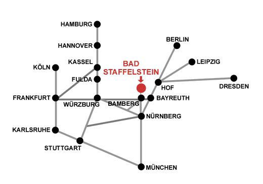 Bad Staffelstein liegt an der Bahnstrecke Bamberg - Lichtenfels. Vom Bahnhof BAD STAFFELSTEIN sind es ca. 800 Meter zum Start und ca. 400 Meter zum Zieleinlaufgelände.